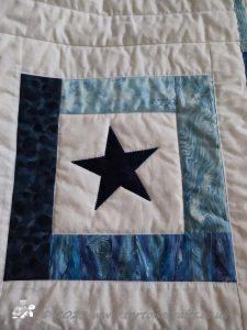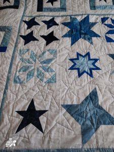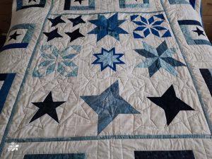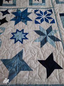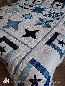 The borders have stars cut using Accuquilt and die, in the centre of a Log cabin style square. The whole quilt was made using the quilt-as-you-go method.