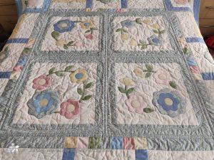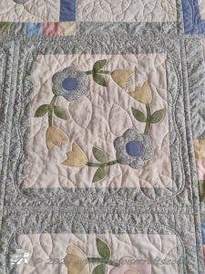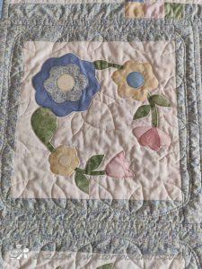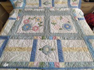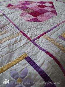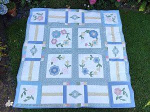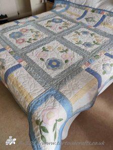 Once all the backing fabric was made, it was a case of layering all eight pieces of the border and corners. I then spent a few days machine quilting them – in the same manner as the four centre squares, with shadow quilting round the applique flowers and then quilting in leaves and curving stems. Once they were all completed, it was time to put the borders to the centre, first two sides, then joining the corners to the other two border and joining these to the centre.