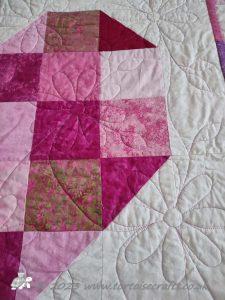 Once the heart was altogether, I layered it with wadding & the backing fabric and decided to machine quilt all over with a flower pattern. I enlarged the flower from a quilting book and cut it out and used it as a template, laying it on top of the heart square, and drawing around it, filling in the details, I drew all the flowers on and then added the connecting lines and leaves free hand. Then machine quilted the design using my walking foot.