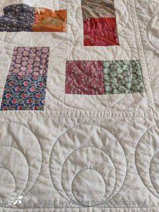 Putting the squares together and making the centre was very quick, its an easy pattern to make. I layered the front with my usual cotton wadding and a backing fabric (I will come back to the back in a while!!!). Then machine quilted it, with circles, using plates as templates. Many of the fabrics have circles or a circular feel and I thought circles would work with the ‘feel’ of the whole thing. That was all done about a year ago February 2024, as the photos came up on my photo feed this week!!!