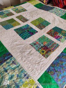 That made sixteen squares. I was in two minds as I was making the squares which fabric I would use to join them, it was either the purple or green from my stash – as these were the only ones that I had enough of. I arranged the squares on our bed with both fabrics between to see which I preferred. Both worked, but the green ‘shouted’ and seemed to make the whole quilt even bolder. The purple pulled it all together and harmonised & calmed it.