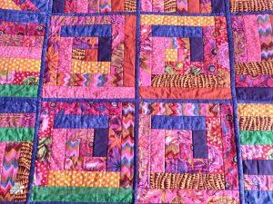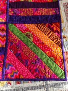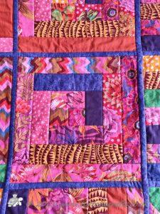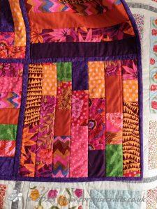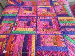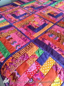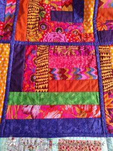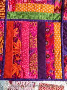 This type of patchwork is ideal for using Jelly Rolls – 2½” wide strips of fabric, I had a small set of bright & bold Kaffe Fassett fabric, which wouldn’t be enough, so I added in from my stash a few plainer fabrics, the bright pink stars, the bright green, two in the purple family and the rust one to make it enough. I have in the past also used this method to make a quilt from all the leftover strips from borders, bindings and joining pieces, all the strips where different widths and it was a great scrappy quilt, harmonised by soft natural calico.