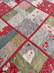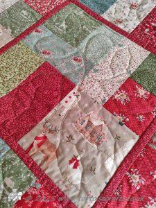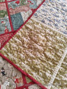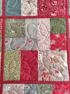 Deciding on the machine quilting took a time, I had thought about doing something traditional like a feather design, then cross hatching, I also looked at a continuous line poinsettia design, all would have worked but didn’t feel right. I wanted the fabric to be the main focus not the quilting. I kept coming back to the fabric called Holly, which was in each of the colourways, holly leaves on a scrolling, curving line. Holly leaves are one of my ‘go to’ Christmas designs, I have used them so much. It felt right to go with the holly leaf. I drew up one, in the size I thought, and laid it on, it worked, so I cut out another six, each square has seven leaves quilted onto it with connecting lines and scrolls. I wrote a Ramble on how I quilted it, and how to describe it – sort of quilting with a walking foot in a sort of free motion, improv way!!! I used standard natural Gutermann cotton in the bobbin and a variegated green Gutermann Cotton 30 for the top.