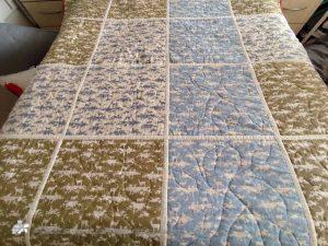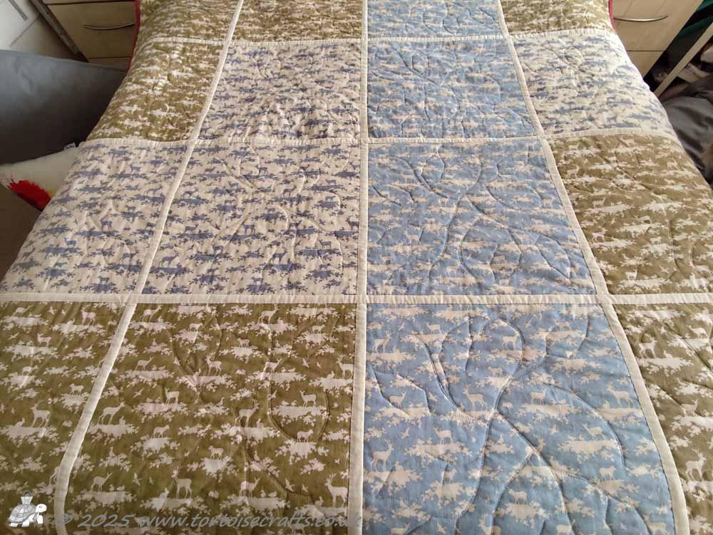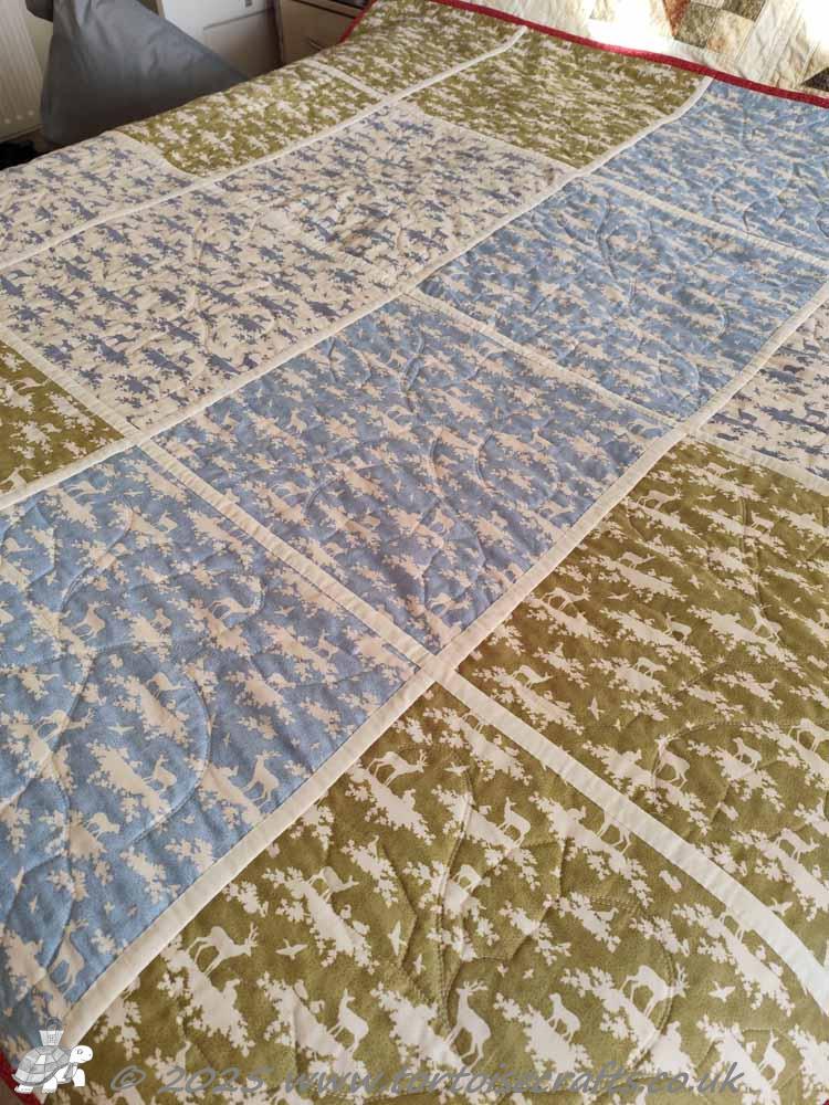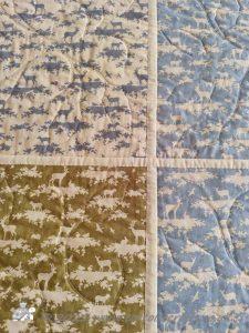 Next step was layering with wadding and backing. In my big box of Tilda fabric was three pieces, a metre of each from two ranges in 2014, they were the same design but in different colour ways, green with cream, cream with blue and blue with cream, a design with deer and other woodland creatures, very directional. I hadn’t ever found a design they would work in, but they would work really well for the back of this quilt.