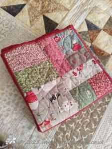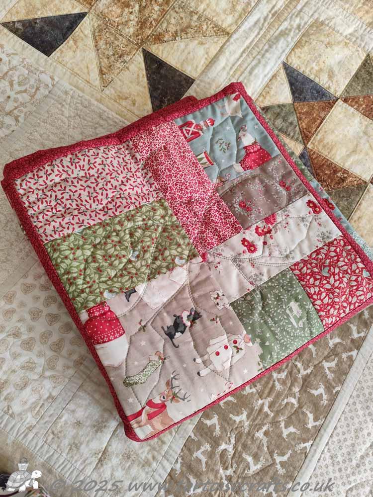 Once I had it all together, I wondered about using the green for the edge binding, but it felt too strong, and it clashed with the fabric I had used on the back!!! The backing fabric was a set of fat quarters that I had got years ago in Aldi, I had used some of it for other projects, but I still had enough for the backing squares and some left over.