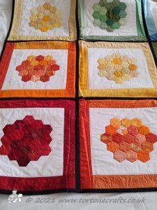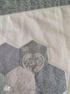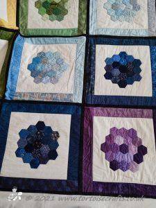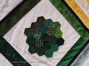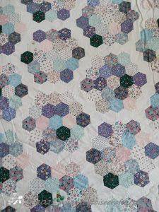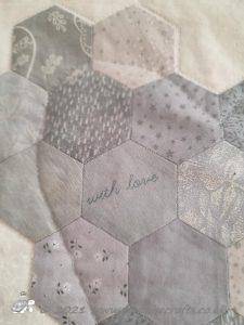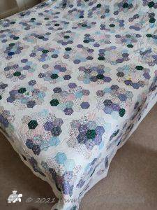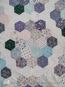 Each 'flower' has nineteen hexagons, with a side length of 1". There are eighteen fabrics the same in each one and then one different fabric and because they are all randomly stitched together it gives it a scrappy quilt and the white 'path' keeps it fresh and clean looking.
