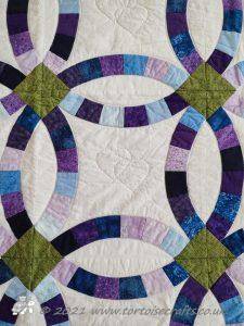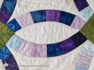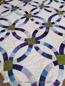 Over twenty years later, in 2012, one of my afternoon class came in and said she was going to make a Double wedding ring quilt for a golden wedding anniversary using the Eleanor Burns method. She had the book Egg Money Quilts that had the templates and instructions and she had got the fabrics on a holiday in America. Everybody was really interested, both the afternoon class and then the morning when I was explaining about it, and they asked me to go through with them and show how to do it. I went home, got the book and all the bits and decided as it was our 20th wedding anniversary later in the year, I would create a quilt for that.