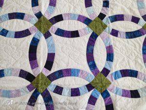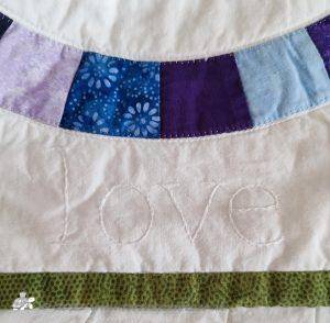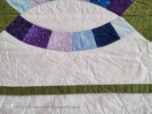 I chose to use blues, purples and a bit of green. Blues - sapphire is a colour that makes me think of Tony. His birthday is September so sapphire is his birth stone and it's a colour that suits him. Purples - amethyst is my birth stone and favourite colour. The green - peridot is Laura's birth stone. Round the edge I quilted words - love, forever....that I felt had meaning, I did them in white to blend in, you have to really look to see them. And then it's been machine be quilted on the white background to highlight the rings. Finally I hand quilted two hearts in the centre of each square. The whole quilt is about love from the double wedding ring pattern, the colours, embroidered words to the hearts.