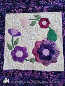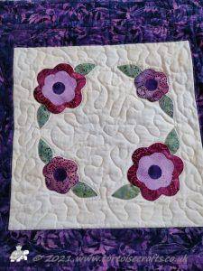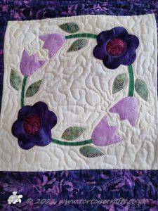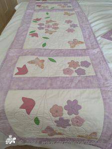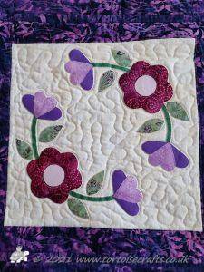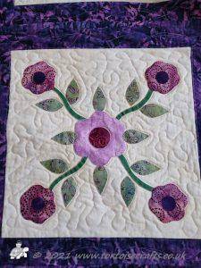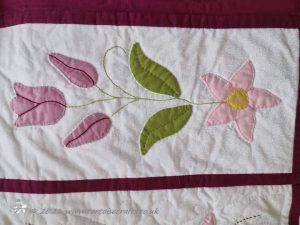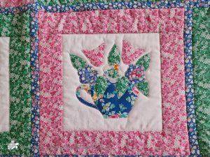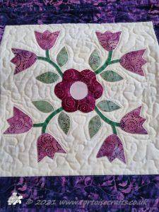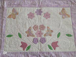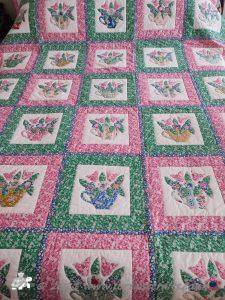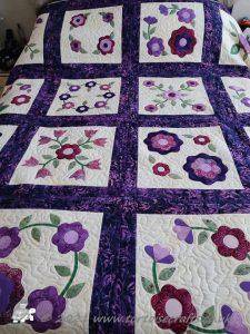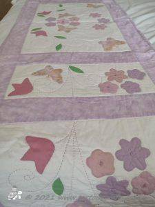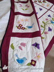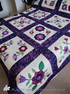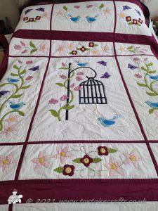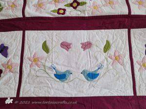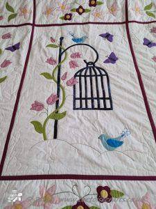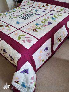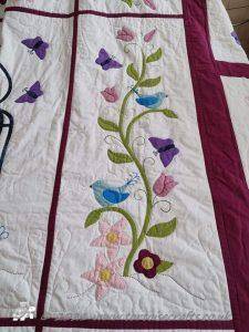 It is appliqued, with lots of hand embroidered details on the flowers and birds tails. There are flowers, birds & butterflies. It can be hand or machine appliqued & the same for the quilting, so it worked for all those I was teaching.