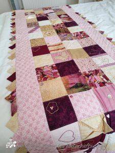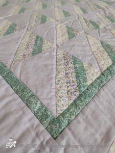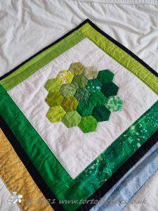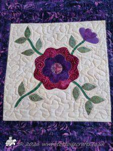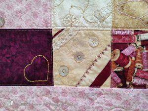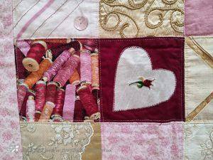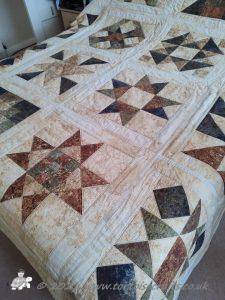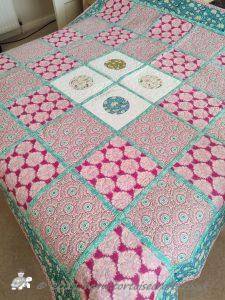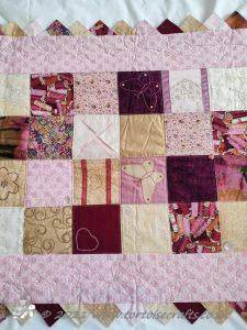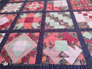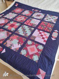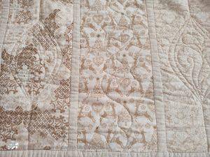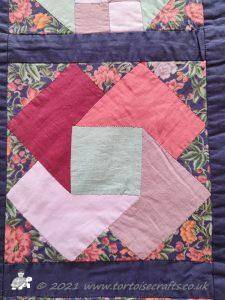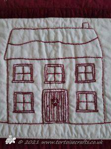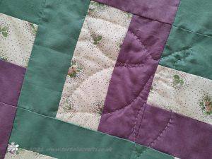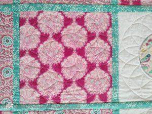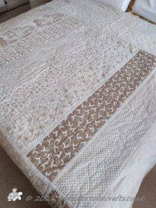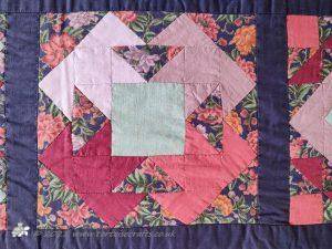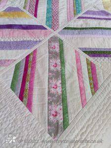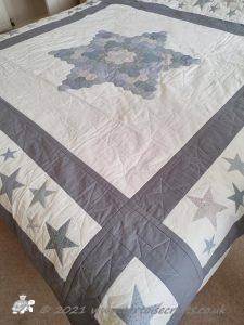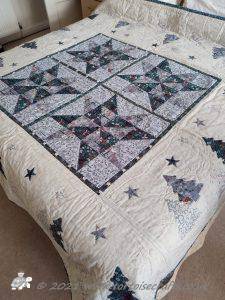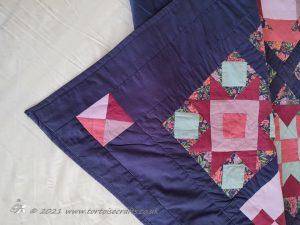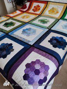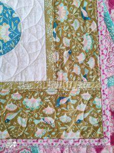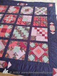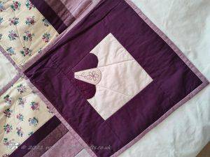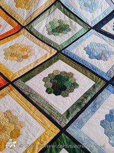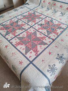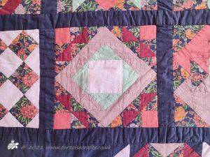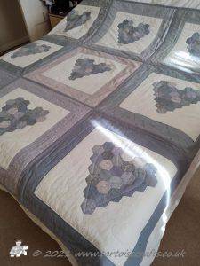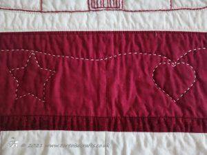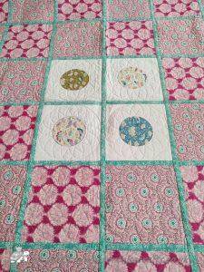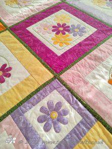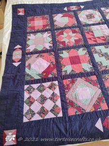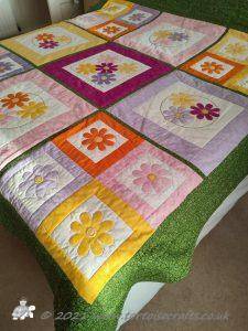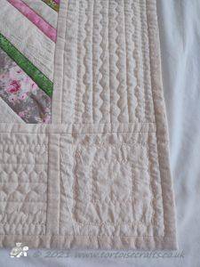 The main quilting of all the squares and the pattern on the border has been stitched on the machine and then I have done the odd piece of hand quilting.
