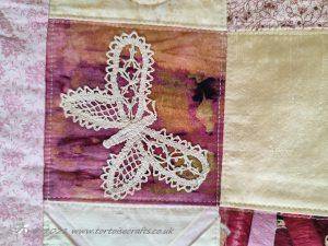 I have then used applique to add the butterflies & hearts and added lace (some are samples of bobbin lace my Mum made) and also pieces of ribbon.