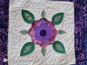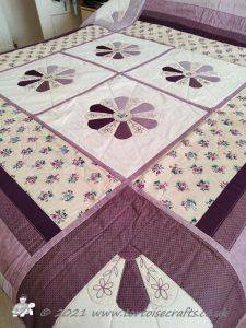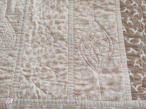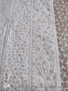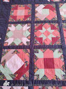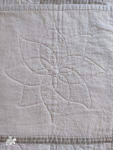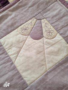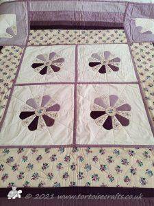 The 36 squares were put together using my usual quilt-as-you-go method, I had to be careful and plan the placement as I needed it colour balanced on the front and also get the pattern in the back. Once the squares were together then borders added, these are quilted with half of the petal design but simplified.