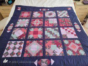 The squares were laid out and joined together using machine quilt-as-you-go method, using the blue fabric as the joining strips, it was also used for the binding.