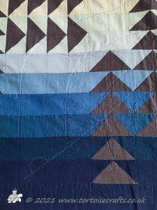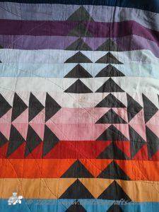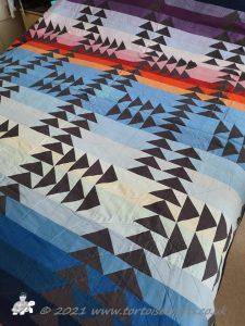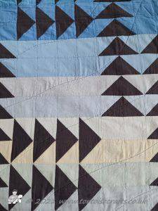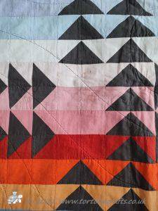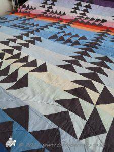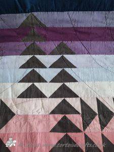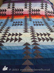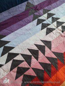 The quilt has 32 rows of colours and the 'geese' are a traditional layout for the Flying geese pattern. All the squares and triangles are worked over papers and stitched together. If you look closely you can see the stitches in places, were I have struggled to find thread that works with both the 'geese' & sky.