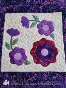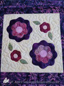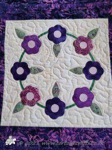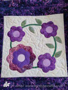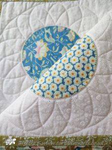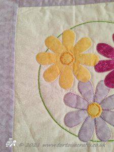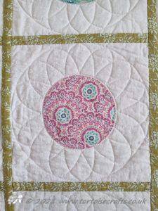 The centre of each fabric circle has a circle then a simple flower and then a more complicated petal design and outer circle was quilted on the background fabric.