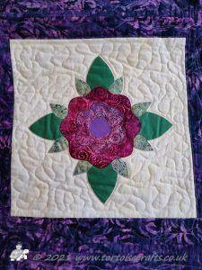 This was how all sixteen squares and border decoration were created. Once all sewn together then the tacking & paper were removed Then all the sashing and borders were added. The whole top was made before being layered with wadding and the backing fabric.