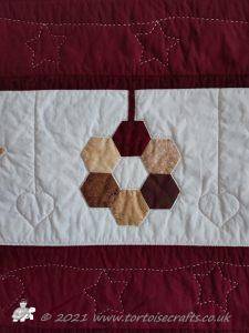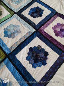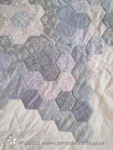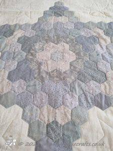 I have no idea how many hexagons are in the quilt - a lot!! & I am not going to count them! The quilt measures 85" X 90" (216 X 229cm). It has 4oz polyester wadding because at the time polyester wadding was what we commonly used. I can't remember cotton or natural fibres being around much and if you did see them at shows they were hugely expensive. Polyester waddings all those years ago weren't like the ones we have today - these were bulkier and slightly uneven. I tended to use a 2oz wadding if I was quilting and even then it wasn't easy - it all needed tacking in a grid to hold the layers together!
