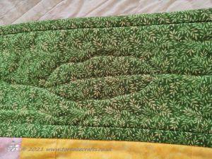 By the feel of the quilt I have used Hobbs Polydown wadding, I used to use it for utility quilts as it would dry quicker. But it can't be pressed. For the quilting I have taken one of the simple leaf motifs in the pattern fabric and enlarged it, then hand quilted then randomly on the quilt. As it's a polyester wadding used it can be quilted further apart.