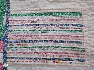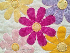 Each square was layered with wadding and backing, on one square the backing is made up of the salvages showing the fabric name and colours. I then machine appliqued and quilted at the same time. The design was stitched using blanket stitch and then all other quilting is just straight stitch.
