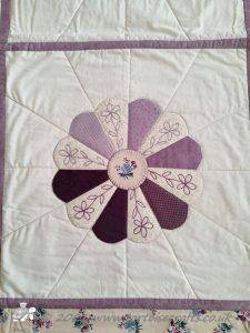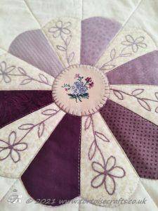 The Dresden plates are made using the paper piecing method and then hand sewn together, before the papers are removed and they are slip stitched onto the background fabric. The circles for the centres where fussy cut to have the flowers in the centre before being blanket stitched on.