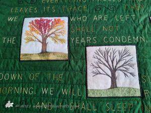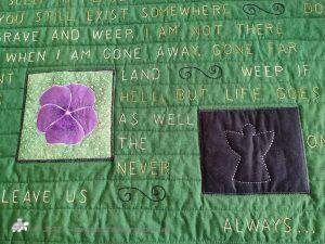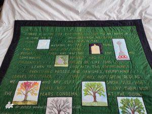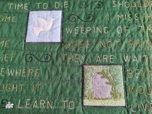 We both wrote down quotes from books, poems and songs that spoke to us. Eventually we came up with the ones that Laura then hand embroidered onto the fabric. The pictorial panels are both mine and Laura's work and are appliqued on. The layers where put together and then machine quilted.