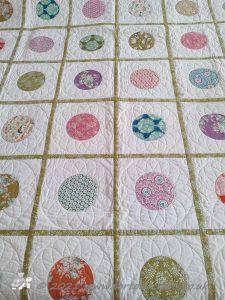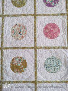 The front is the circles, which when you look closely, each circle is machine appliqued on to a 9.5" square of Makower Essentials white on white fabric, using a coordinated thread and blanket stitch. Each square was layered with wadding and either the other circles or one or the two pink fabrics and then I quilted the design on.