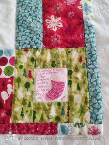 In the right hand bottom corner is the label from the t-shirt, it's worked into the corner block. It was so sweet I just had to use it.