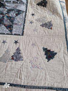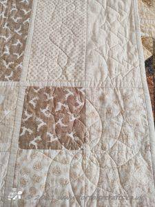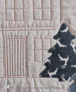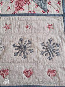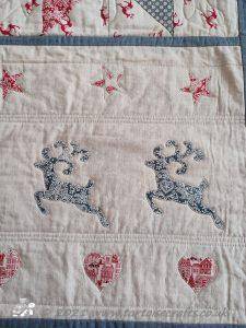 This isn't a traditional Christmas quilt! It is a subtle natural colour, the fabric is Makower Scandi Christmas, which over the years, they have created this range in red and greys but also in the past in natural colour. The prints on the fabric are the same as the other colours, trees, hearts, reindeer and snowflakes.