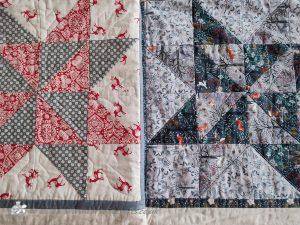 As with most of the quilts I make, both of these are quilt-as-you-go. The Lewis & Irene in eight sections and the Makower Scandi in twelve pieces.