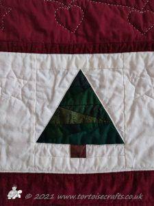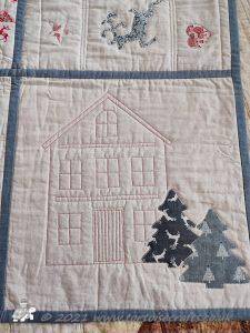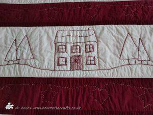 The Makower Scandi one, which I used as a demonstration of techniques and the Accuquilt in my classes was the second one made. The borders, two have hearts, stars and reindeer and the other two had hearts, stars and snowflakes, all cut using Accuquilt dies. I had the four borders made and was playing with ideas for the corner blocks - did I make four more Sarah's Choice block, applique something but in the end I was inspired by the fabric and quilted a house and appliqued trees with it. I just had to make sure they all went the right way when I put the quilt together!!