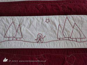 The centre stripe has a hand embroidered design of a winter landscape with a house in the centre, stylised trees, snowman and stars.
