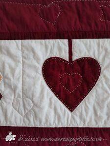The quilting is a combination of machine and hand. Big stitch quilting in a thick cream thread is used for the stitched hanging garlands on the deep red borders and also other details on some of the applique bits.