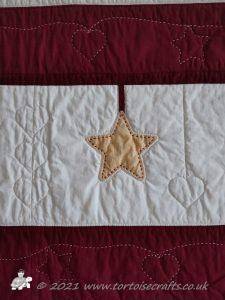 The fourth stripe is a combination of hanging decorations, paper pieced hexagon ones, & machine applique stars and hearts.