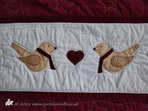 The top and bottom stripes are made from foundation pieced trees. The second stripe has pairs of birds with scarves, with a heart in-between, all machine appliqued.