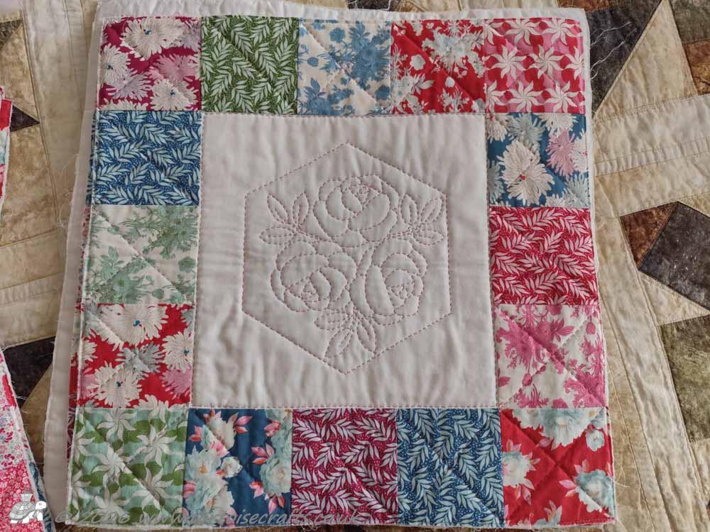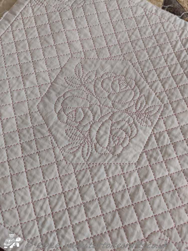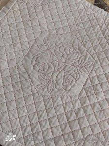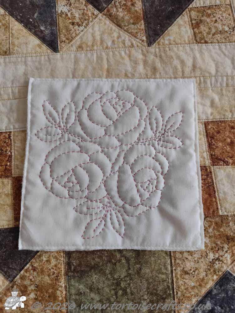 After a bit of thinking I decided that once I finished the embroidery that I was doing in my quiet, mindful ‘me’ stitching half hour I do each day, I would not pick out a new cross stitch kit from my stash, but I would use that half hour to hand quilt Laura’s Roses quilt. I can, with that three and half hours a week, get a panel quilted – so far in February I have finished two panels!!!
