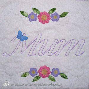 I was inspired by all the script cushions in the shops to make a Mum one for my Mums. I embroidered/quilted the word Mum and then appliqued flower borders at the top and bottom and I also created a Quilted Postcard for each of the Mums.