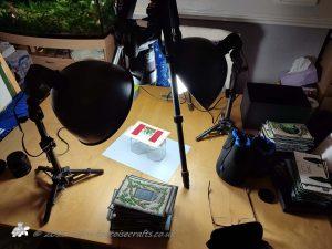 Photographs – I have to remember to take photos as I go along. I don’t have a dedicated area for photography with the lights set up. When we were doing the last book – The Art one, then the kitchen table was permanently set up as a photographic area, with the backdrop, lights and tripod ready. We did this as the postcards needed to be photographed at each little stage, sometimes every day.