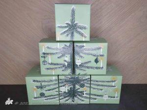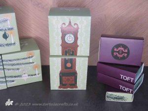 So, back to the advent, in November, it arrived in a specially designed, themed brown cardboard box (and yes it is being kept to store bits in!!!), ohh it was exciting!!! Under the tissue paper was a moss green fabric bag with TOFT embroidered on it and lovely dusky purple drawstrings with rose gold ends. Inside …… twenty four boxes, from bigger ones to smaller ones. Two of the bigger boxes make up a picture of a grandfather clock and the others make up a fir tree. The smaller ones are a deep plum colour with the advent logo on. Its all beautifully designed and co-ordinated with the contents.