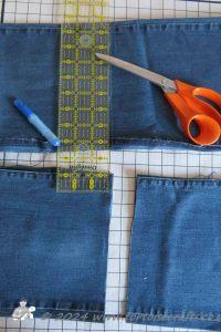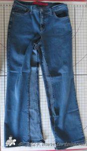 I had written in my planner, turning the jeans into a skirt on the Sunday when Tony & Laura were both at work. First thing to decide on the length, I didn’t go long midcalf as I wasn’t sure I would have enough fabric, so I decided on 27” long. I marked and cut the bottom of the legs off.