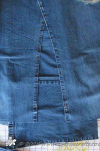 Working the front was easy, lay it out, pin the curve of seam flat and then insert the fabric from the bottom of the legs into the V shaped gap, I realised that the piece I had cut off the bottom would fit best if I turned it sideways, so the side seam of the leg became a feature in the V shaped panel. It was then pin and stitch it in place. Trim off the excess fabric from the inside and tidy up the seams. I was really happy with how it all went.