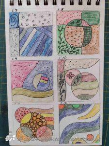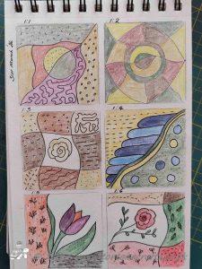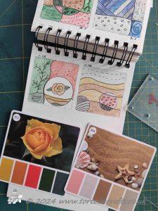 It is very much ‘horses for courses’ as the saying goes. Quilts are made in the kitchen and workroom, as are the first and last stages of making the Quilted Postcards. The hand embroidery especially the embellishing on the postcards is done in the evenings in my armchair in the sitting room with my lamp on my work (and extra strong glasses!!!). My painting/drawing art stuff is sometimes in the workroom and sometimes in the kitchen – sort of depends what I am working on. The daily 10 minute drawing & colouring goes everywhere, its just a pad of paper and pencil case of pencils and a few inspirational cards – I have taken it on cruises, up to Derbyshire, in fact anywhere we go, it doesn’t take up much space.