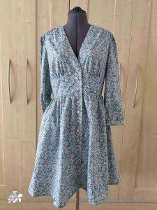 I really don’t like hand sewing buttons on, one or two ok but 18!!!! Luckily my sewing machine stitches buttons on – but I am always, slightly terrified as it does the first few stitches – will it go through the holes, or hit the button breaking the needle or the button?!!!! I started and after six buttons broke the needle as it hit the button, put in a new needle, rethreaded the machine and…..broke the needle again. I was getting frustrated and hungry – I really wanted to finish the dress before lunch but….. I walked downstairs, made my lunch, calmed down and then went back to the machine. Stitched all the rest of the buttons on, tied off and trimmed the threads, pressed the dress, searched for threads I had missed and hung it on Laura’s bedroom door.