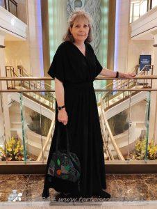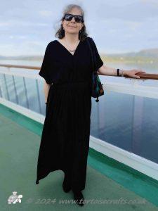 So, when we decided after the first cruise, that we would carry on, I needed some smart evening dresses and originally I had the wrap dress, then I decided to make two more of the wrap, twist and tie dresses – a black one that is floor length on me and the dark blue one that is calf length. Laura has worn both of them, they are just shorter on her!!! They still have loads of life left in them it’s just….