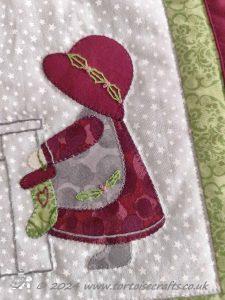 Fast forward to the summer and I was tiding my workroom after the end of term and I came across the folder with the Sunbonnet Sue’s. I knew, from another conversation in the class that they would be too small to use for teaching but what if I went a bit bigger? And what if I combined them with embroidery, as again a number of the class are doing embroidery with patchwork projects? A whole new set of ideas were sparked.