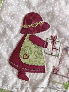 Ideas!!! Winter term – Christmas project, a small quilt, but could be a wall hanging, or if more borders added a bigger quilt. Make one panel for a cushion. Machine applique Sue’s but they could be hand applique if that’s the preferred method, large enough not to be fiddly or complicated. Hand embroidery backgrounds and embellishments – the amount can be changed from simple to full on, again to sort everyone’s tastes. A couple of small add-on projects also. And of course for the Christmas dislikers a non-Christmas version!