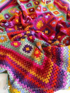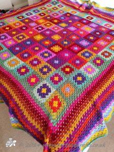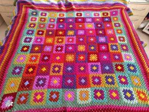 I started the middles at the beginning of June, it came with me on our cruise to Norway, I would sit on our balcony watching the fjords go past and crochet, by the time we came home all the second rows were done. Over the rest of the summer, I worked on the third rows and then it was work out the placement of the squares to put it together. Laura and I decided that we really couldn’t get too hooked up on the colour placement – Laura really struggles with random, needing everything to be mathematical, while I am absolutely fine with place anything anywhere. We laid all the squares out on the bed, rearranged a few to get a pleasing spread of colours, carefully put them in labelled piles and then I crocheted them together. Usually, my crochet blankets are a summer project being finished in late September, this year it has slipped into autumn, and I think you could say we are in early winter now!!! By early September the centre was together and then I started crocheting the border, it is a big border of all the colours!!!