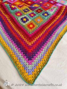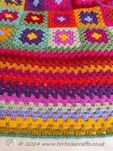After finishing my crochet blanket of 2023, I had been thinking of using bright, sunny, happy colours for my 2024 make and then out came the Sungold yarn pack and the story behind the colours and I decided that I definitely would use it for my next Granny Square blanket, it had more colours than I would usually use but that added to the design challenge. In January with the Sungold CAL starting, I looked at all the lovely blankets being made either using the Sungold yarn and pattern, those that used the pattern and other yarns and then those that made it in other patterns, its great to see what people create – it makes me think more and more about colours and designs.