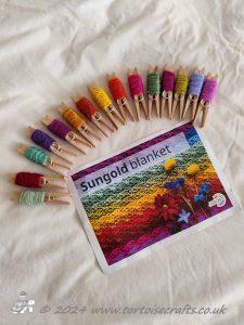 So, this latest finish….about this time last year Lucy at Attic24 with Wool Warehouse released the yarn pack for the Sungold Cal, that would start in January 2024. I have followed Attic24 for a while, her blogs are gentle, finding the colour and beauty in the everyday normal life in a Yorkshire market town, the blankets she designs are stunning and the colours gorgeous – so much work goes into them. I have thought about using one of her yarn packs to make a blanket but up to this one I have always worked out my own colours.
