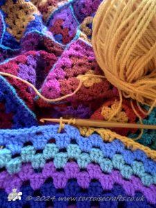 The plan is to keep crocheting in random lengths of the five colours round and round till I have the square to a nice blanket size and then to use the small amount of the Batik Swirl I found for a couple of rounds to finish it off. So, that’s it the blanket I am starting to work on….