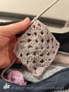 Now my portable go anywhere project is crochet Granny squares!!! All I need is yarn and a hook and I can make them, you will find me crocheting away in the car, at hospital appointment while waiting, on the Underground (as does Laura – she crochets TOFT kits!!!), while away on holidays, I can do them anywhere. Once I have made the squares, making them up into a blanket and adding borders tends to be an evening thing, or when I just need busy hands but don’t want to think – sort of rhythmic mediative work.